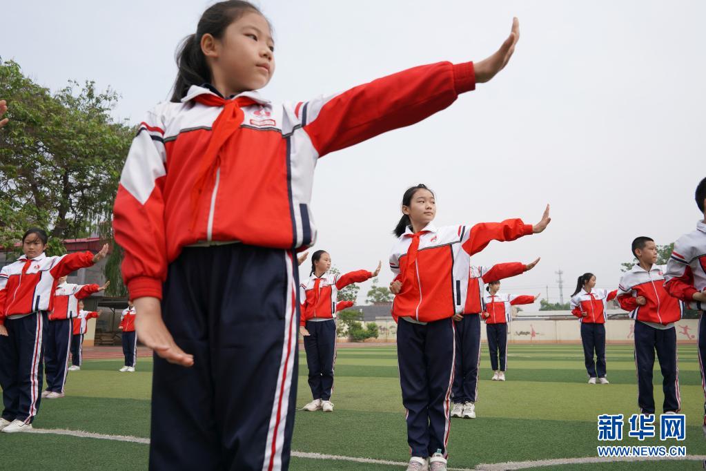 5月19日,邢臺市內丘縣實驗小學學生在操場上練習武術操。