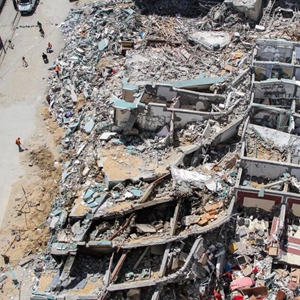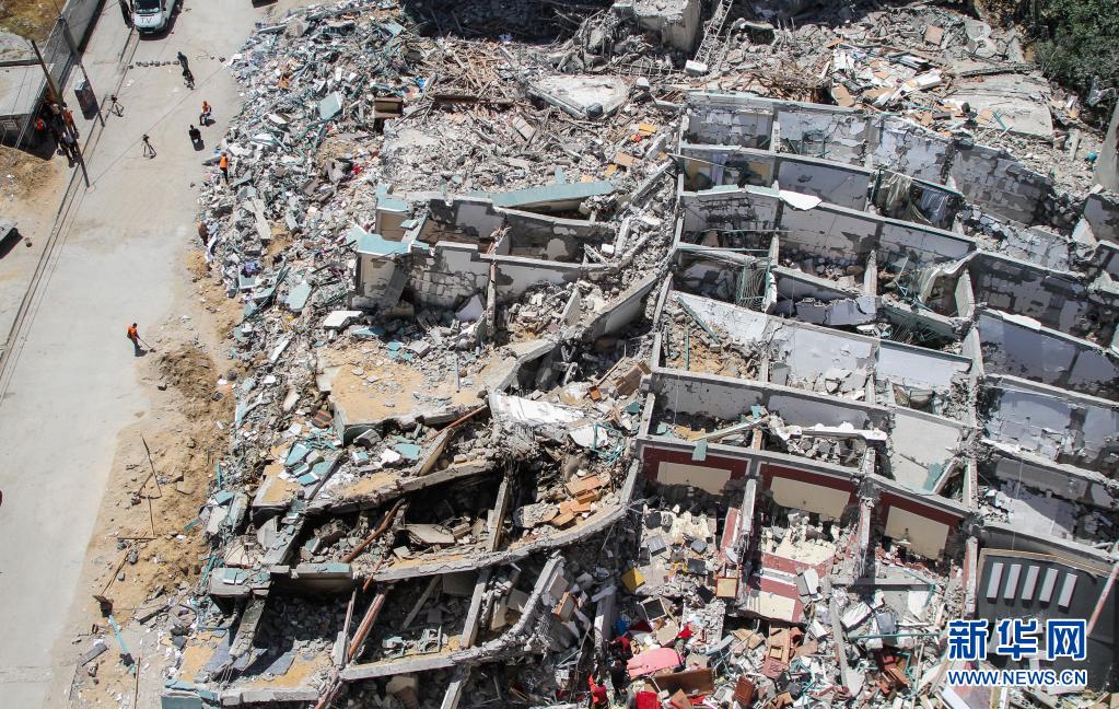 5月23日,巴勒斯坦人在加沙城走過(guò)遭以軍空襲損毀的賈拉塔。5月10日以來(lái),以色列與加沙地帶武裝組織之間爆發(fā)嚴(yán)重沖突。20日晚,哈馬斯與以色列方面各自宣布,雙方已達(dá)成?;饏f(xié)議,?;饛?1日凌晨開(kāi)始。新華社發(fā)(里澤克·阿卜杜勒·賈瓦德攝)