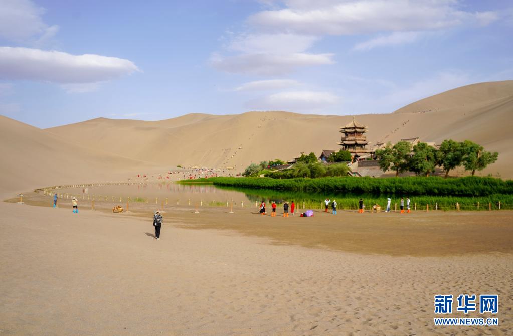 5月30日,游客在月牙泉畔觀光、拍照。