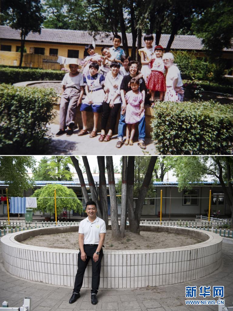這是一張拼版照片,上圖為:童年時期的黨龍祥(后排左二)在太原市社會(兒童)福利院留影(資料照片,受訪者供圖);下圖為:5月31日黨龍祥在太原市社會(兒童)福利院留影(新華社記者楊晨光攝)。