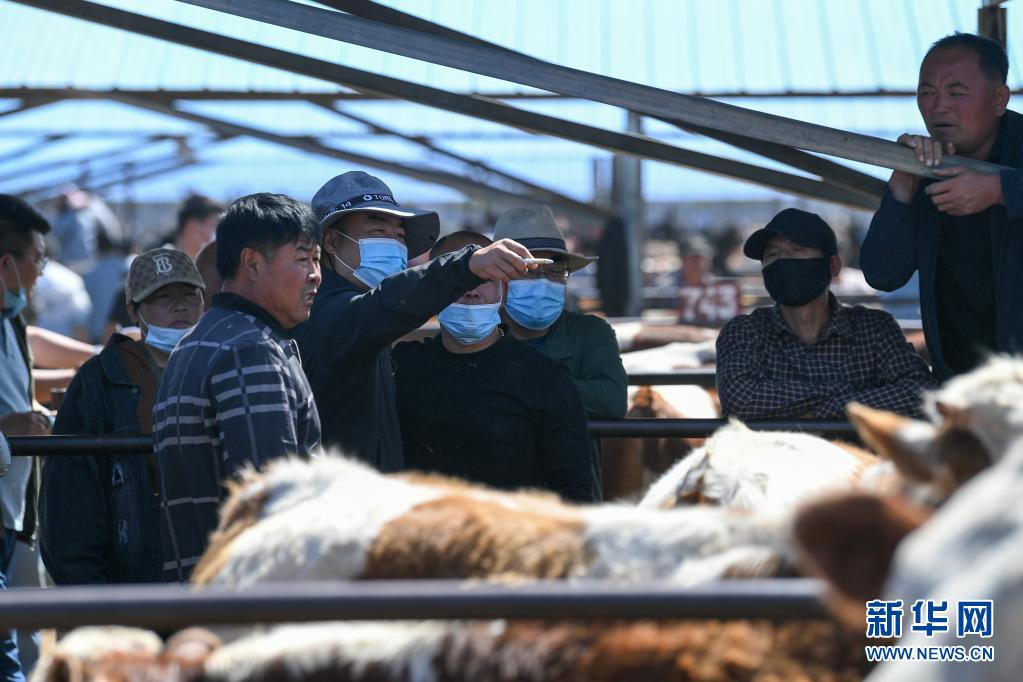 6月1日,交易者在開(kāi)魯牛市交易攤位看牛詢價(jià)。
