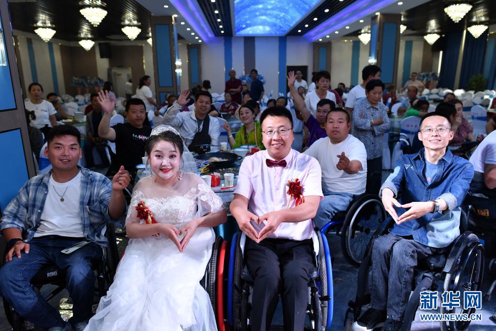 新郎周海云和新娘關(guān)美及親友們?cè)诨槎Y上合影(6月15日攝)。新華社記者 詹彥 攝