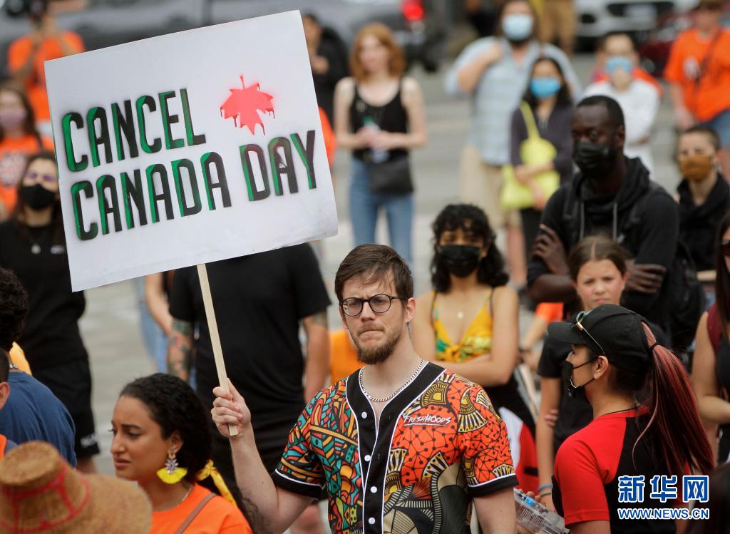 當(dāng)天是加拿大日,上千名抗議者在溫哥華集會,悼念加拿大在強(qiáng)制“同化”原住民過程中遭到殘害的兒童,呼吁取消加拿大日的慶?;顒?。