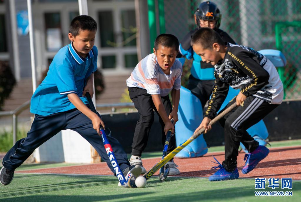 塔城市第二小學曲棍球隊員加熱斯·努爾白拉提(前左)、申世豪(前中)與哈爾肯·夏里甫在隊內(nèi)訓練賽中拼搶(6月11日攝)。