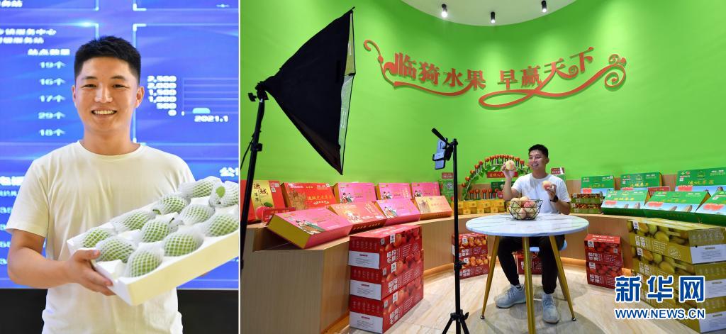 拼版照片:左圖為董晨旭展示山西省臨猗縣產(chǎn)的梨;右圖為董晨旭通過網(wǎng)絡(luò)直播介紹當(dāng)?shù)禺a(chǎn)的桃(7月13日攝)。今年22歲的董晨旭是臨猗縣北景鄉(xiāng)張村人,他年紀不大,卻有著豐富的開店經(jīng)驗。為了幫助鄉(xiāng)親們在網(wǎng)上銷售水果,他于2020年3月開始在電商平臺創(chuàng)業(yè),店鋪在旺季達到一天一萬余箱的銷售量,讓他對農(nóng)村電商發(fā)展充滿了信心。