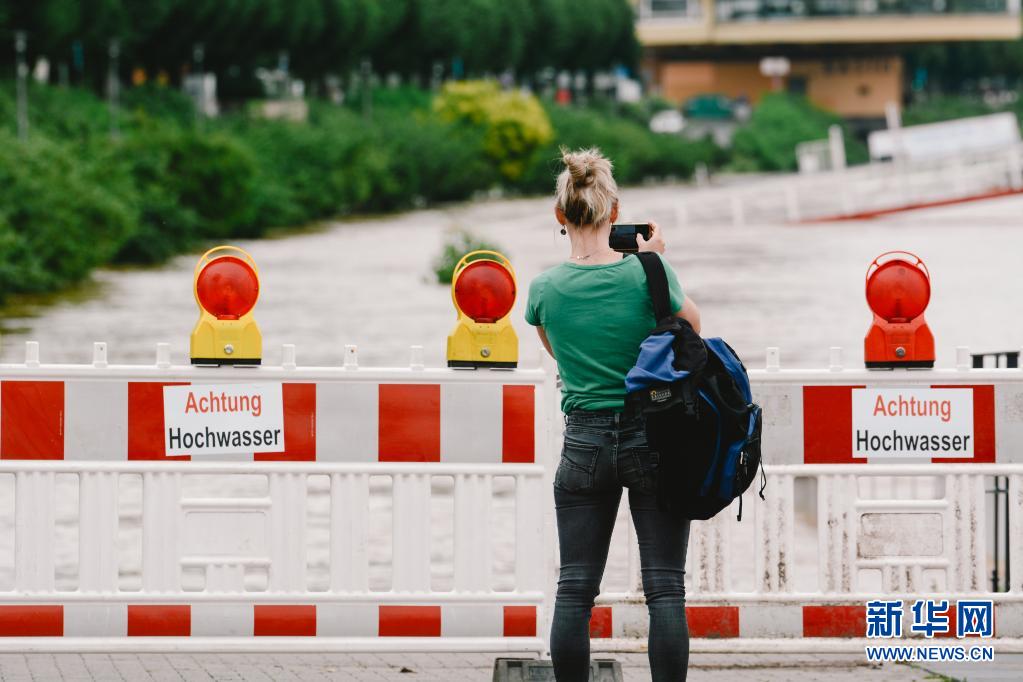 7月15日,在德國西部城市科隆,一名女子在因水位上漲而封鎖的萊茵河岸邊拍照。