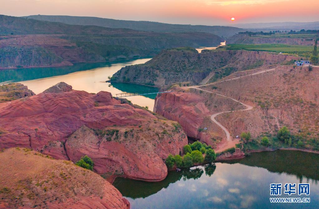 8月6日,朝霞映照下的靖邊縣龍洲鎮(zhèn)波浪谷丹霞景區(qū)(無人機照片)。