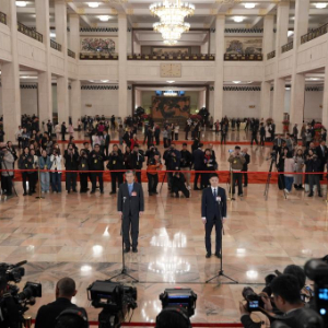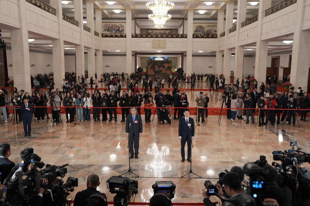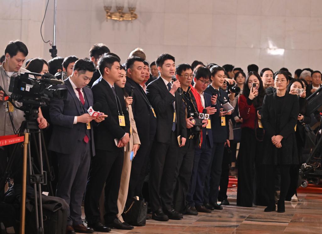 3月5日,第十四届全国人民代表大会第四次会议首场“代表通道”集中采访活动在北京人民大会堂举行。这是记者在现场提问。