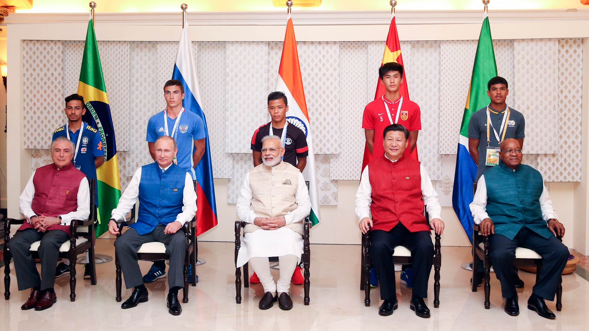 10月15日,國家主席習近平與印度總理莫迪、南非總統(tǒng)祖馬、巴西總統(tǒng)特梅爾、俄羅斯總統(tǒng)普京在印度果阿同參加金磚國家17歲以下少年足球賽的各國代表隊隊長合影。新華社記者 姚大偉 攝