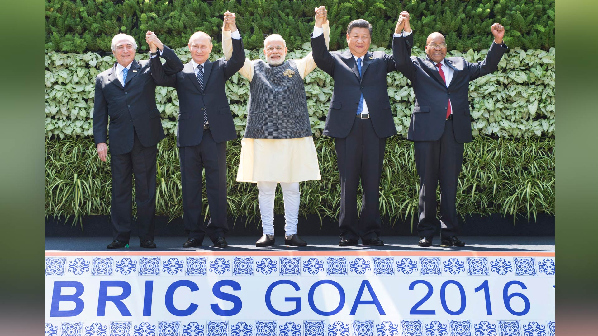 10月16日,金磚國家領導人第八次會晤在印度果阿舉行。中國國家主席習近平、印度總理莫迪、南非總統(tǒng)祖馬、巴西總統(tǒng)特梅爾、俄羅斯總統(tǒng)普京出席。這是5國領導人合影。新華社記者 謝環(huán)馳 攝