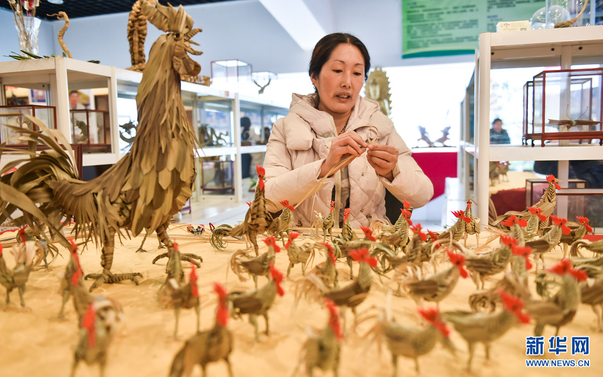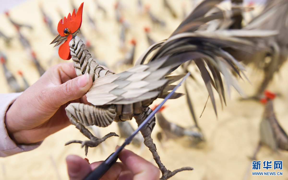 1月15日,洛陽(yáng)棕編藝人賈淑娟在創(chuàng)作“金雞”棕編作品。為迎接雞年到來(lái),河南洛陽(yáng)棕編藝人賈淑娟歷時(shí)一個(gè)月創(chuàng)作出近百只活靈活現(xiàn)的“金雞”棕編作品,制作工序包括棕櫚葉的選材、熏蒸、陰晾、編制、組合、粘貼等。新華社發(fā)(黃政偉 攝)