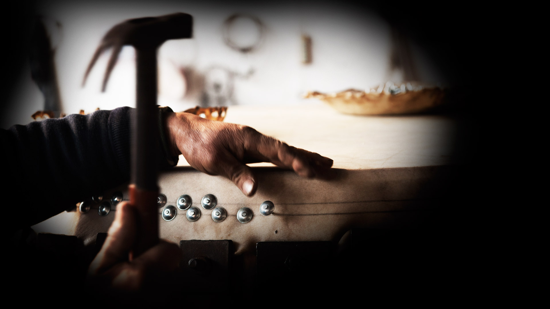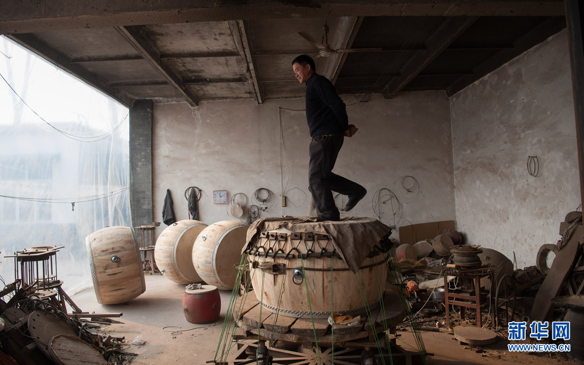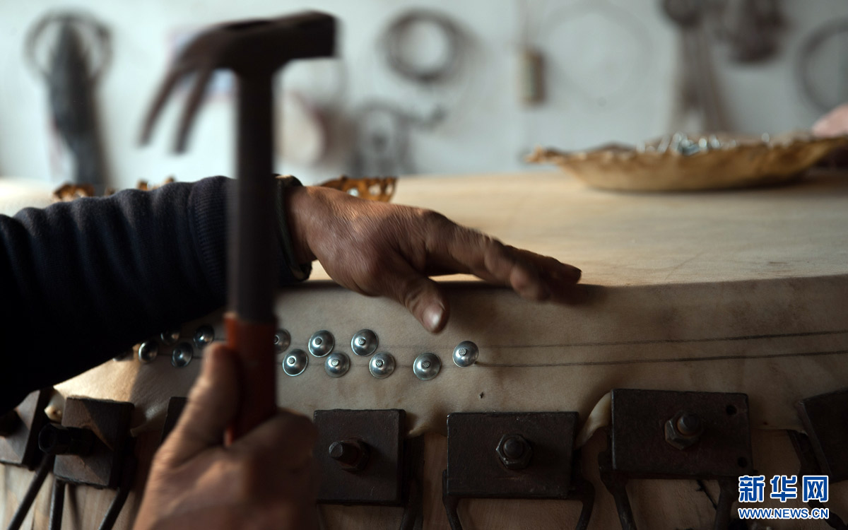 1月17日,在藁城黃家莊河北名華樂器制作有限公司內(nèi),工人正在釘釘子固定鼓皮。河北石家莊藁城戰(zhàn)鼓表演及其制作工藝,2016年被評(píng)為河北省級(jí)非物質(zhì)文化遺產(chǎn)。據(jù)藁城戰(zhàn)鼓的傳承人胡造寶介紹,藁城戰(zhàn)鼓源自架鼓,在清末時(shí)吸收了武術(shù)動(dòng)作,演變成了戰(zhàn)鼓。藁城戰(zhàn)鼓表演時(shí)配合鑼、鈸一起演奏,鼓點(diǎn)激昂,讓人振奮。藁城戰(zhàn)鼓需經(jīng)過(guò)挖鼓幫、蒙鼓皮、踩鼓等近二十道工序,平均耗時(shí)十天左右才能制作完成。新華社發(fā)(蒲東峰 攝)