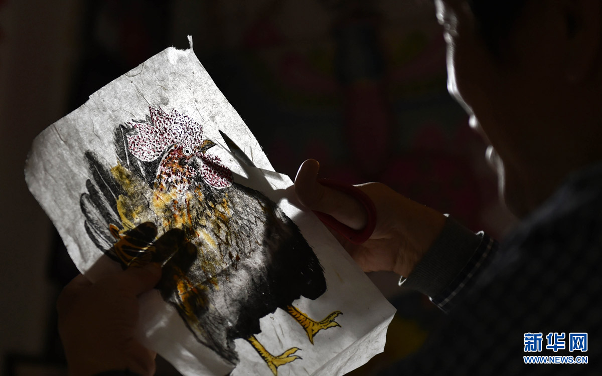 1月4日,在位于天津市古文化街的工作室里,魏國(guó)秋剪出繪好的“雞年”風(fēng)箏。