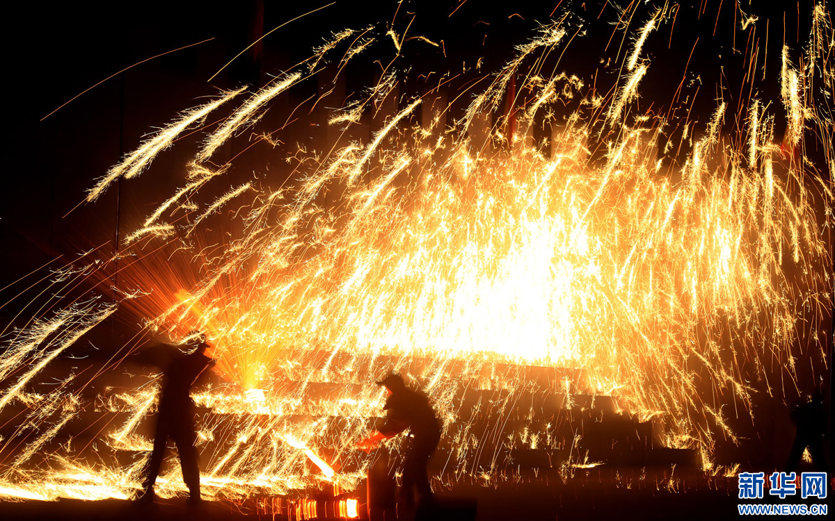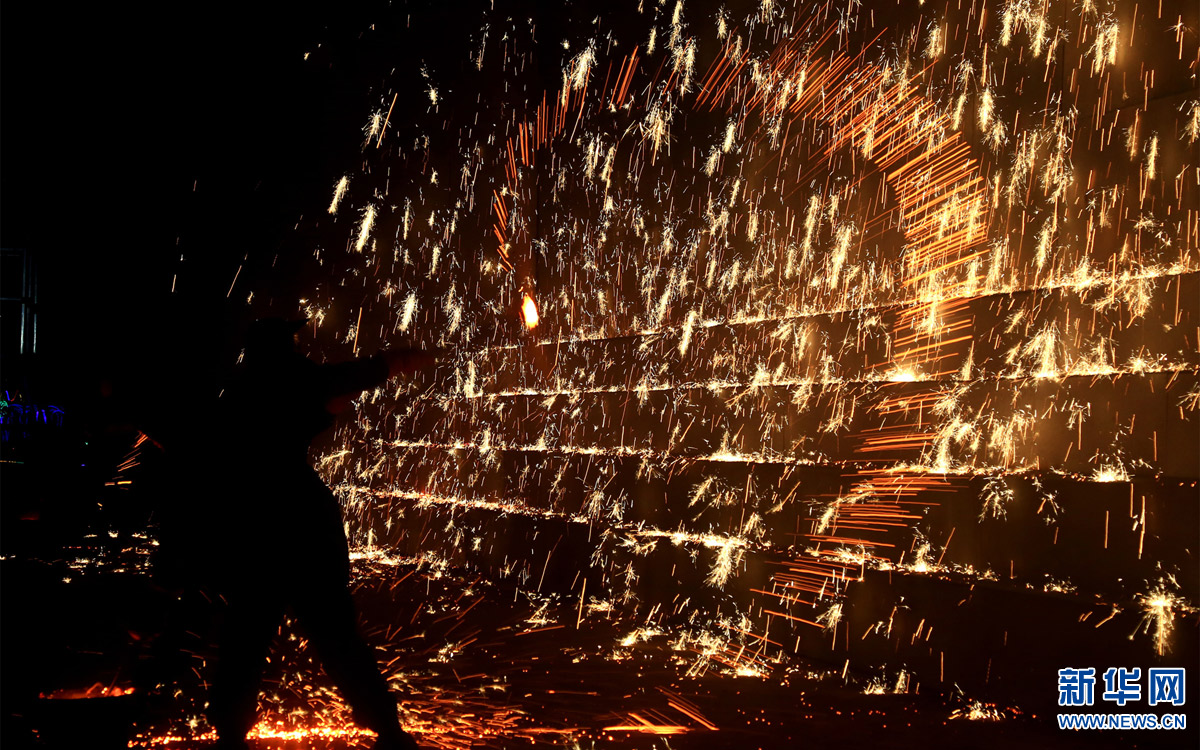 1月12日,磁縣本地匠人在“打鐵花”。當(dāng)日,河北磁縣開始舉行“打鐵花”慶新年活動(dòng)?!按蜩F花”是以小煉鐵爐將生鐵化成鐵水后,用木板將鐵水加鋸末打上天空,鋸末在空中燃燒形成“鐵花火雨”四濺飛揚(yáng)的景象。打鐵花”是當(dāng)?shù)貧v史悠久的民俗娛樂活動(dòng)。新華社發(fā) (趙鴻宇攝)