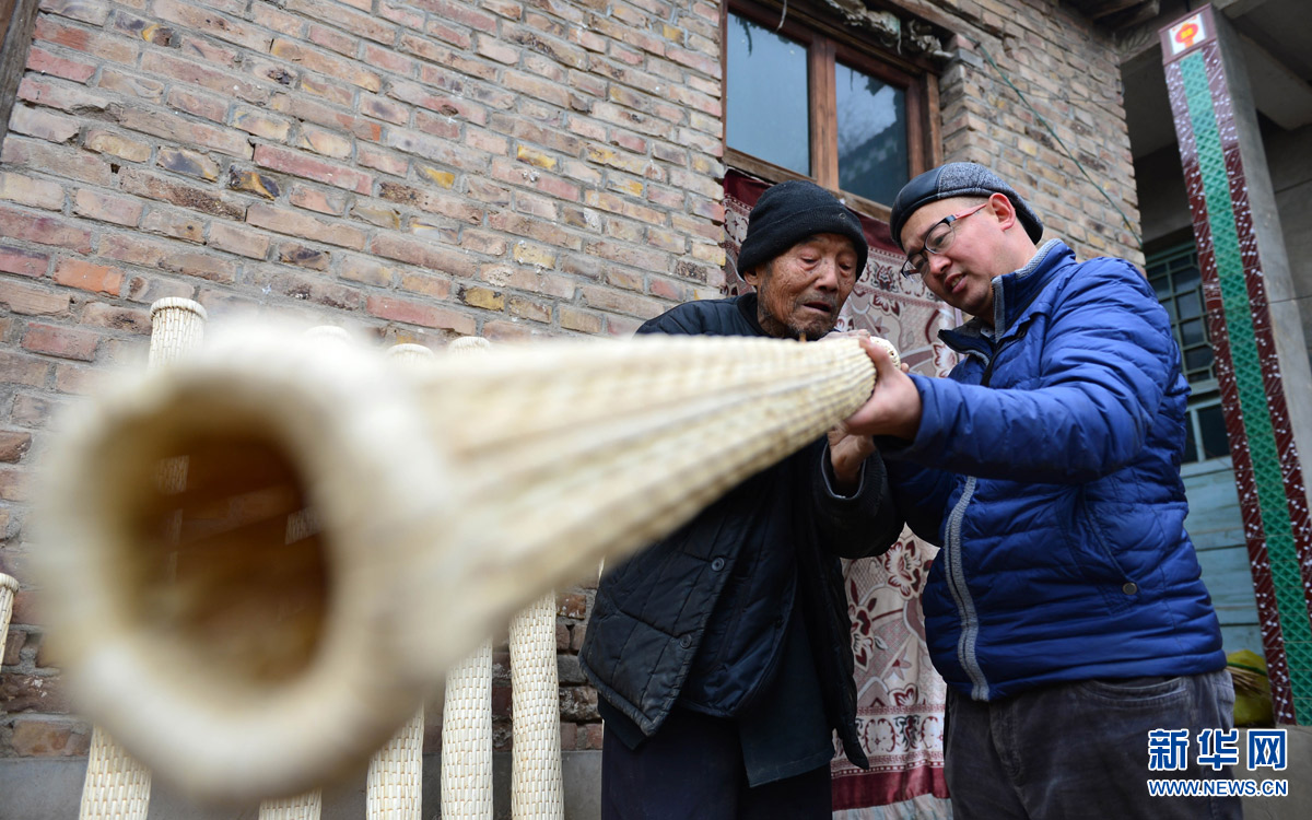 1月6日,在河北省廣宗縣,侯義敏(右)向82歲的柳編藝人馬振堂介紹柳編樂器雨棒的相關(guān)知識(shí)。