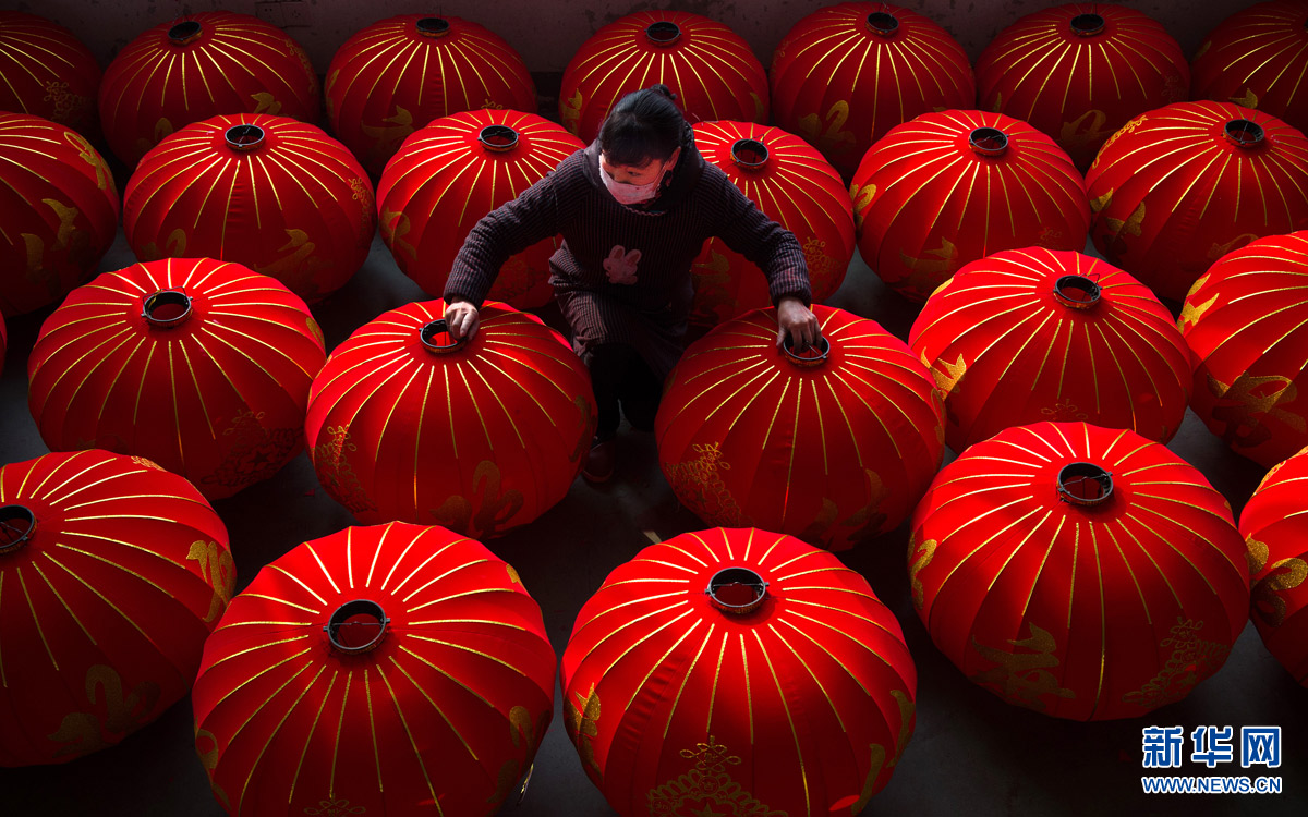 1月11日,在開明工藝宮燈制造有限公司內(nèi),一名工人在整理紅燈籠半成品。