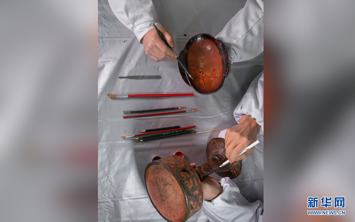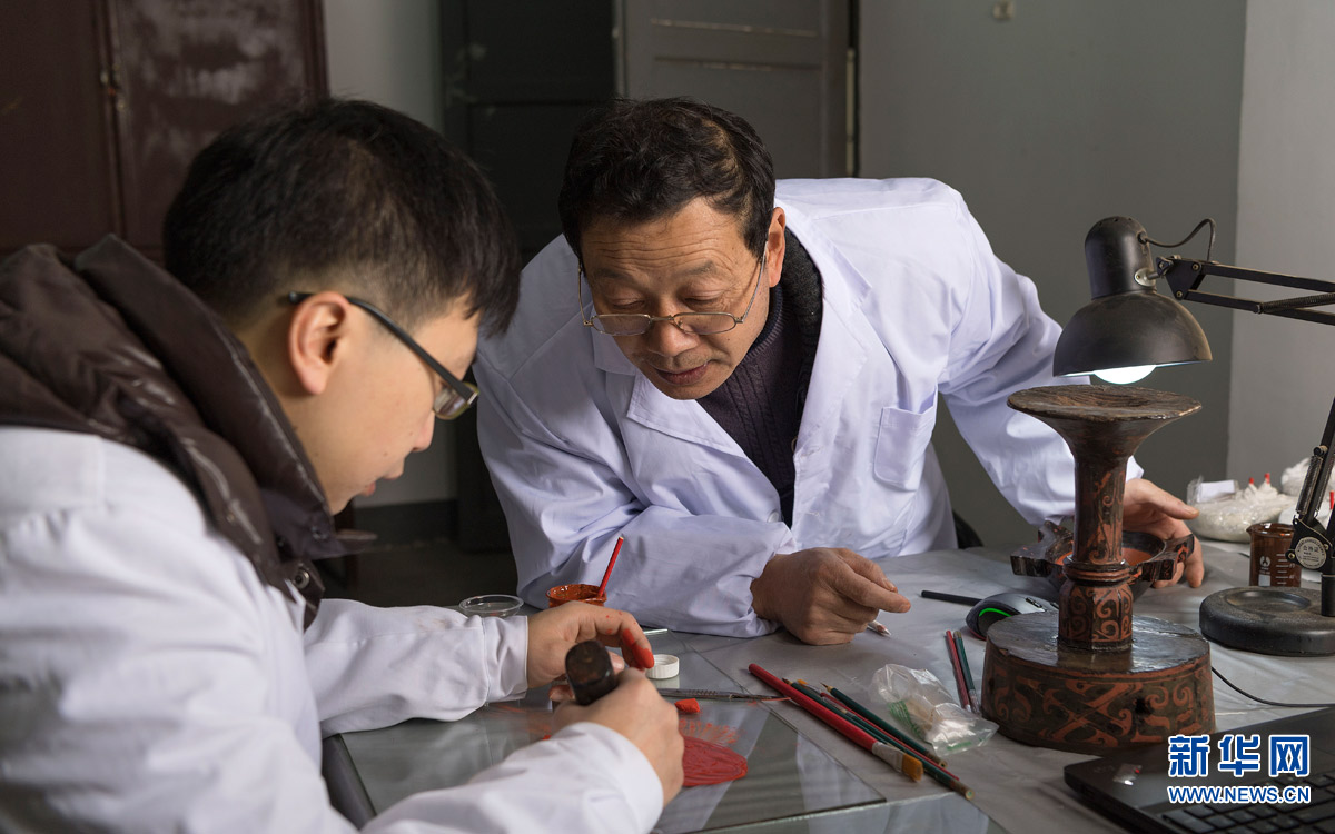 1月10日,杜道子(下)和同事在修復(fù)竹木漆器文物。年過(guò)六旬的杜道子是湖北省荊州文物保護(hù)中心的竹木漆器文物修復(fù)專家、楚式漆器修復(fù)技藝傳承人。原本褪色、破損、殘缺的竹木漆器,經(jīng)過(guò)他的修復(fù),都能重放光彩,再現(xiàn)當(dāng)年的神韻。杜道子從小便接觸學(xué)習(xí)繪畫、木雕,后來(lái)學(xué)習(xí)工藝美術(shù)專業(yè)的他開始從事傳統(tǒng)美術(shù)設(shè)計(jì)工作。1987年,杜道子作為專業(yè)性人才被引進(jìn)荊州博物館,從此開始正式進(jìn)入竹木漆器修復(fù)行業(yè)。至今他從事竹木漆器文物修復(fù)工作已30年。在此期間,杜道子修復(fù)的竹木漆器文物超過(guò)兩千件,其中包括荊州出土的虎座鳳架鼓、湖南長(zhǎng)沙馬王堆出土的朱地彩繪棺等國(guó)家重點(diǎn)文物。荊州文物保護(hù)中心的竹木漆器文物修復(fù)水平在全國(guó)領(lǐng)先,每年都有大量全國(guó)各地的竹木漆器文物送來(lái)進(jìn)行修復(fù)。這些送修文物病害各不相同,修復(fù)工藝繁瑣,從清洗、脫水、干燥,到髹漆、彩繪、封護(hù)等等,要進(jìn)行十幾個(gè)步驟才能讓沉睡的文物“復(fù)活”。杜道子說(shuō):“文物修復(fù)是一門藝術(shù),琢磨久了,同手里的竹木漆器間也像有了對(duì)話一般,通過(guò)不同的漆面、紋理,就能琢磨出這件文物在千年前的用途和使用環(huán)境。看到一件件竹木漆器在自己手里重獲‘新生’,一種自豪感便會(huì)油然而生?!?新華社發(fā)(熊琦 攝)