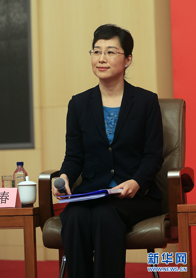 ??? 10月19日,十九大新聞中心舉辦集體采訪,邀請政法戰(zhàn)線代表談全面推進(jìn)依法治國。圖為主持人襲艷春。新華網(wǎng) 郝廣鵬攝
