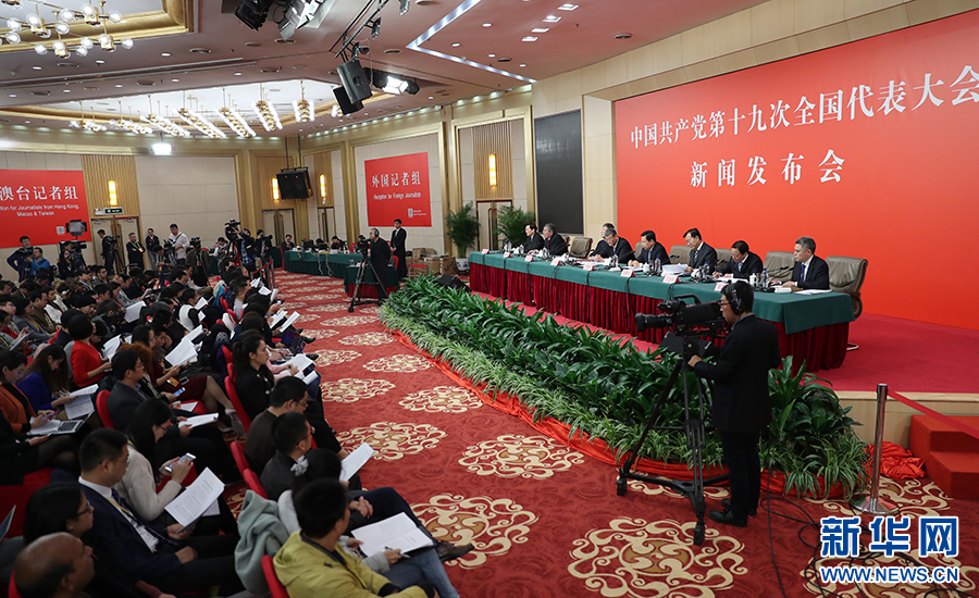 10月26日上午10:00,中國共產(chǎn)黨第十九次全國代表大會新聞發(fā)言人在梅地亞賓館二層新聞發(fā)布廳召開專題新聞發(fā)布會,請有關(guān)方面負責(zé)人解讀十九大報告,并回答記者關(guān)心的問題。圖為新聞發(fā)布會現(xiàn)場。新華網(wǎng) 翟子赫 攝