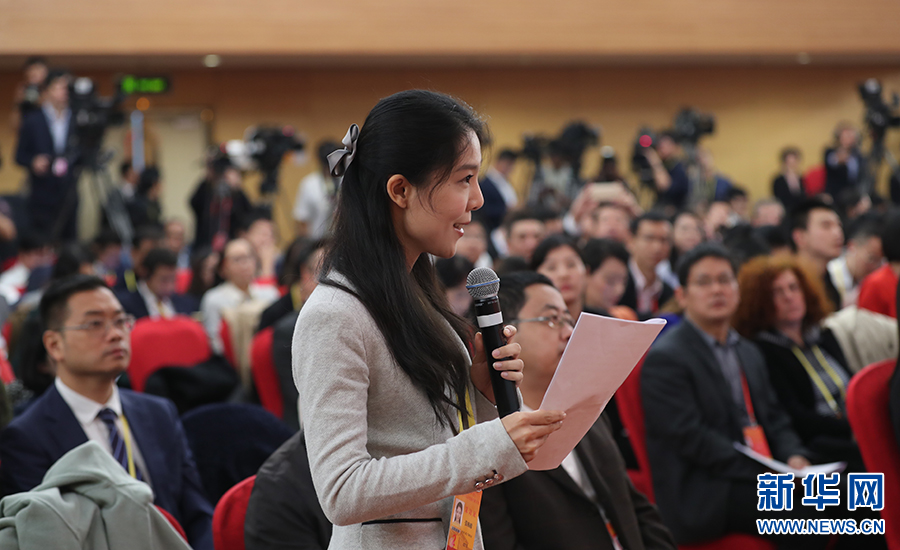 ? 10月26日上午10:00,中國共產(chǎn)黨第十九次全國代表大會新聞發(fā)言人在梅地亞賓館二層新聞發(fā)布廳召開專題新聞發(fā)布會,請有關(guān)方面負責人解讀十九大報告,并回答記者關(guān)心的問題。圖為中央人民廣播電臺記者提問。新華網(wǎng) 王成云 攝
