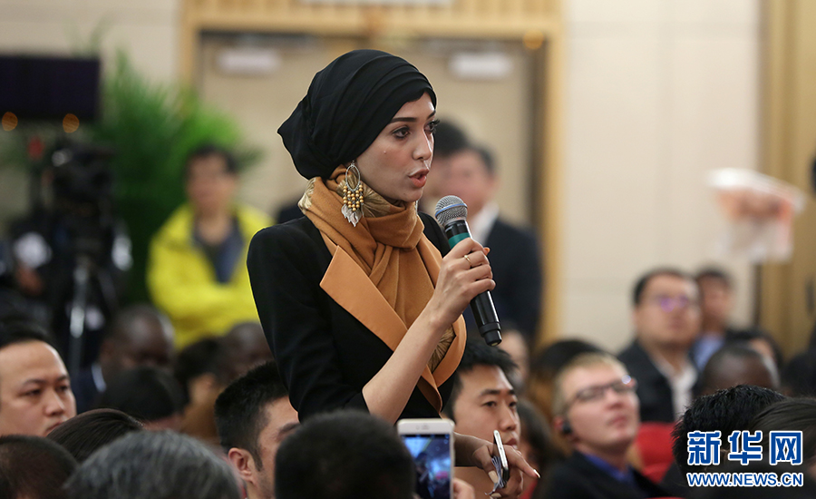 10月26日上午10:00,中國(guó)共產(chǎn)黨第十九次全國(guó)代表大會(huì)新聞發(fā)言人在梅地亞賓館二層新聞發(fā)布廳召開專題新聞發(fā)布會(huì),請(qǐng)有關(guān)方面負(fù)責(zé)人解讀十九大報(bào)告,并回答記者關(guān)心的問題。圖為迪拜中阿衛(wèi)視記者提問。新華網(wǎng) 王成云 攝