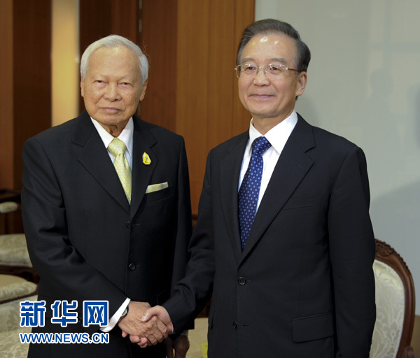 ??? 11月21日,國務(wù)院總理溫家寶在曼谷會(huì)見泰國樞密院主席炳·廷素拉暖上將。 新華社記者 張鐸 攝