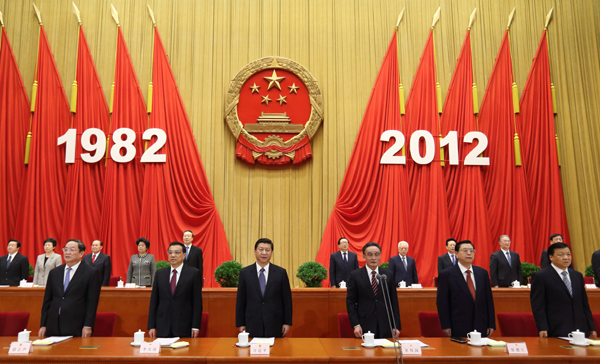 ??? 12月4日,首都各界在北京人民大會堂集會,隆重紀(jì)念現(xiàn)行憲法公布施行三十周年。習(xí)近平、吳邦國、李克強(qiáng)、張德江、俞正聲、劉云山等出席大會。新華社記者蘭紅光攝