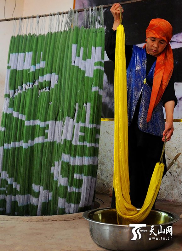 而今,這種技法漸漸被注入新鮮血液。6月底,當記者走進吉亞鄉(xiāng)喀了塔吐格曼村家庭作坊,在院子里看見正在染色的艾比比班 卡斯木。一蘸、一染、一擰、一轉(zhuǎn),一套動作下來就能浸染一小段艾德萊斯了,有了現(xiàn)成的絲線和染料后,這項神秘扎染技藝顯得更加快捷了,村民們也樂于接受這種高效的生產(chǎn)模式。