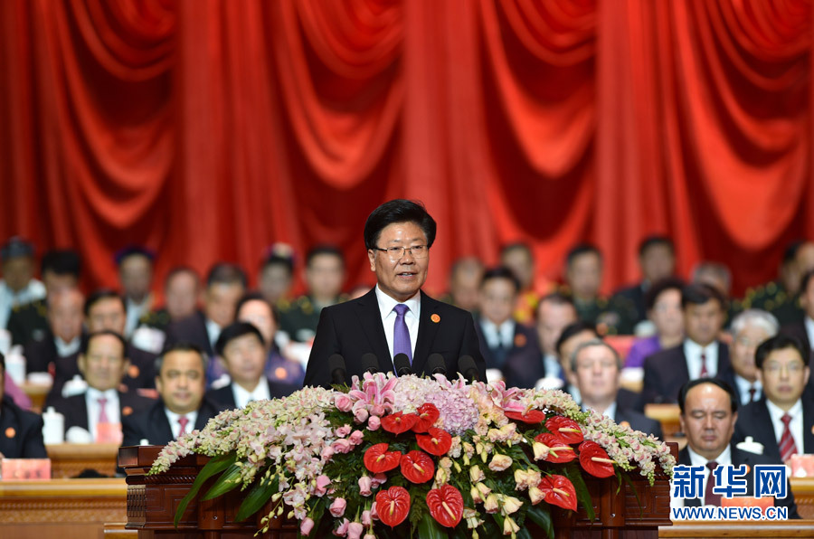 ??? 10月1日,慶祝中華人民共和國成立66周年暨新疆維吾爾自治區(qū)成立60周年大會(huì)在新疆人民會(huì)堂隆重舉行。這是中共中央政治局委員、新疆維吾爾自治區(qū)黨委書記、新疆軍區(qū)黨委第一書記、新疆生產(chǎn)建設(shè)兵團(tuán)黨委第一書記、第一政委張春賢發(fā)表講話。新華網(wǎng) 郭小天 攝
