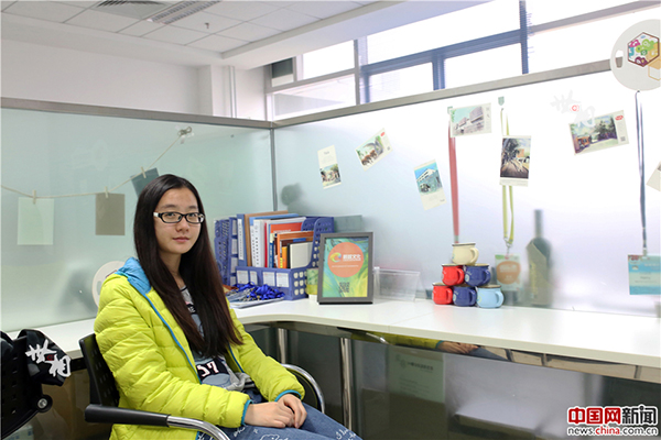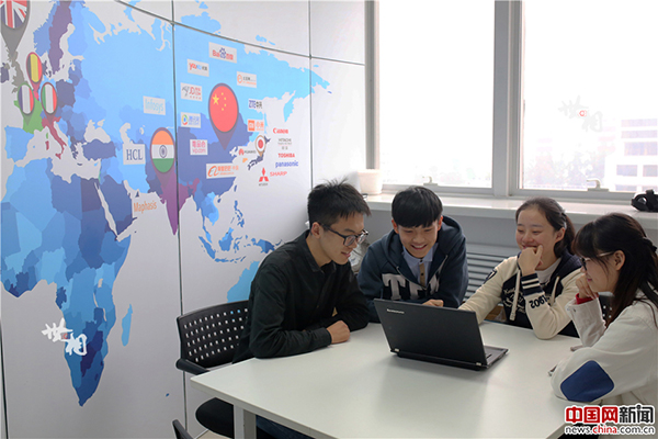 蜂巢創(chuàng)意空間的創(chuàng)業(yè)團隊在討論方案,墻面上貼滿了全世界有名的企業(yè)。