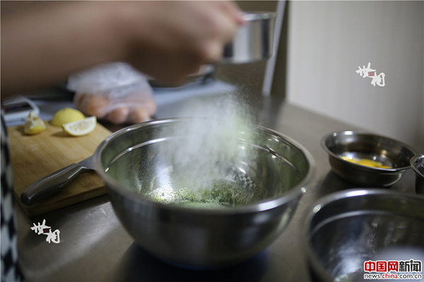 陳騫要求每一道工序都要精心制作,這樣蛋糕才能達到理想中的口味。圖為陳騫用篩子將綠茶粉均勻撒入甜點原料中。