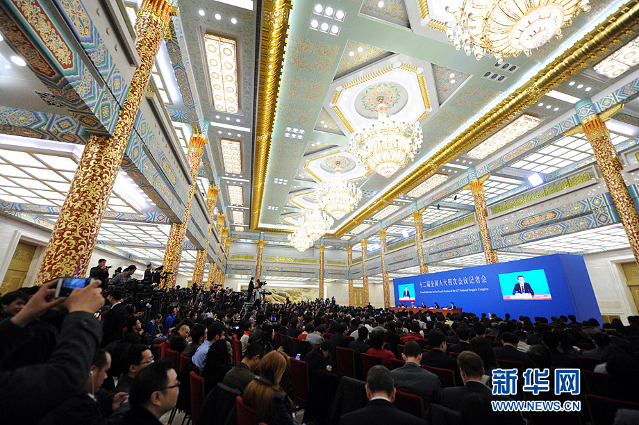 3月16日上午,國務(wù)院總理李克強(qiáng)在人民大會堂三樓金色大廳會見采訪十二屆全國人大四次會議的中外記者并回答記者提出的問題。圖為記者會進(jìn)行中。新華網(wǎng)/中國政府網(wǎng) 陳競超 攝