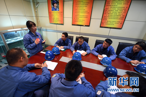 在甘肅酒鋼集團(tuán)宏興鋼鐵股份有限公司碳鋼薄板廠內(nèi)的王云平勞模創(chuàng)新工作室,王云平(左二)宣講黨的十九大精神(11月1日攝)。 新華社記者 范培珅 攝