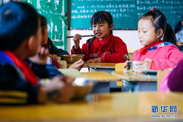 11月8日,湖南省花垣縣十八洞小學學生在教室吃午餐。 新華社記者 劉金海 攝