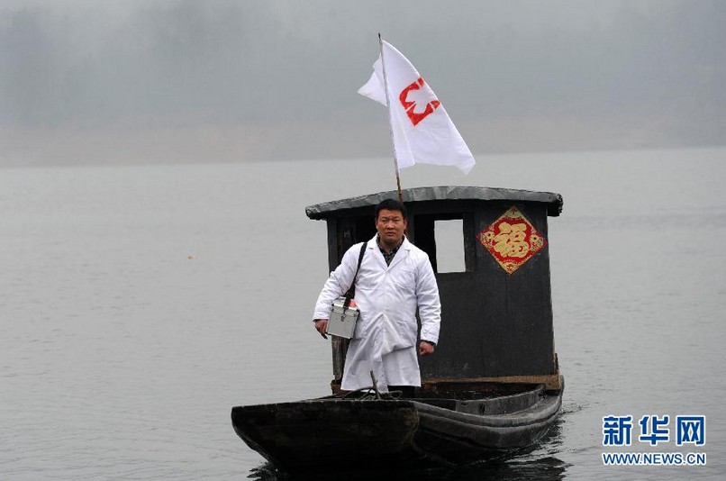 海島的東島岸邊,常年停靠著一個(gè)船屋,外面掛著“麻埠鎮(zhèn)齊山村海島衛(wèi)生站”的牌子。39歲的余家軍是船屋的主人,1999年衛(wèi)校畢業(yè)后回到齊山村,和妻子吳起嬌把家安到了船上,取名“海島衛(wèi)生站”,他也成了這里唯一的村醫(yī)。18年里,不論是白天黑夜、刮風(fēng)下雨甚至下雪,余家軍都劃著一條小木船,每日來(lái)往于東西兩島之間,為200多名村民看病,這條木船也被村民們親切地稱為“水上120”。