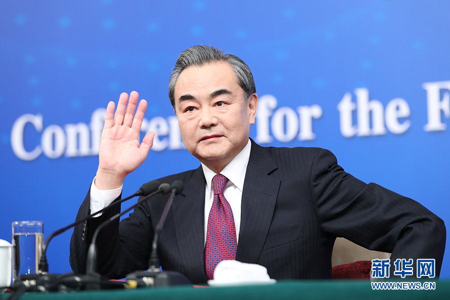 十二屆全國人大五次會議新聞中心于3月8日(星期三)10時在梅地亞中心多功能廳舉行記者會,邀請外交部部長王毅就“中國的外交政策和對外關(guān)系”的相關(guān)問題回答中外記者的提問。圖為外交部部長王毅向記者示意。新華網(wǎng)/中國政府網(wǎng) 孫韜 攝?