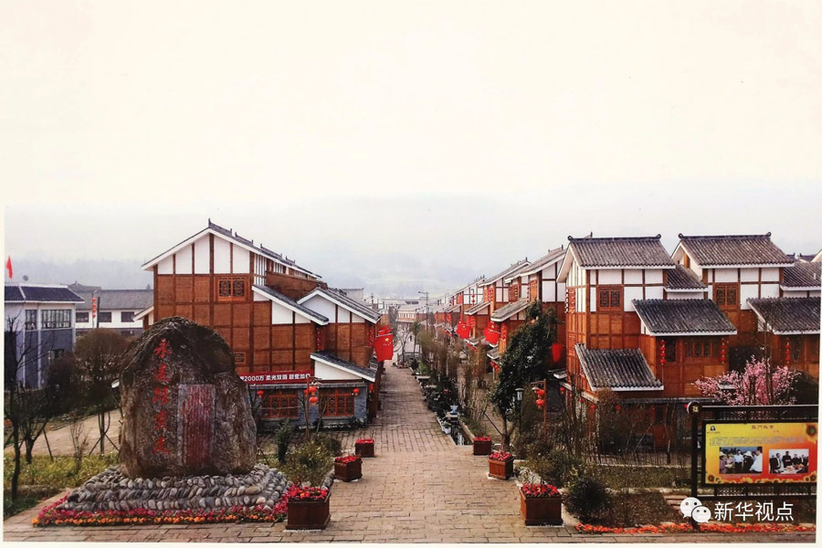 震中青龍場村,一排排小樓整齊排列,村口矗立的感恩石上鐫刻著“永遠跟黨走”5個大字。