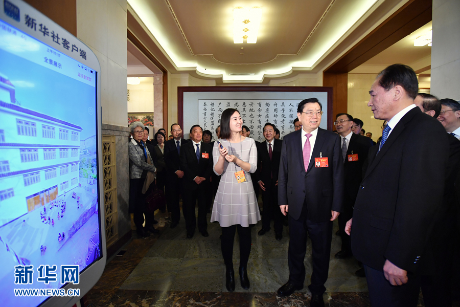 3月14日上午,中共中央政治局常委、全國人大常委會委員長張德江在北京人民大會堂看望參加十二屆全國人大五次會議新聞報道工作的中央主要媒體負(fù)責(zé)人和工作人員,代表大會主席團(tuán)向所有參加人大會議報道的新聞工作者表示誠摯慰問和衷心感謝。這是新華社社長蔡名照陪同張德江觀看新華社新聞產(chǎn)品演示。 新華社記者李濤攝