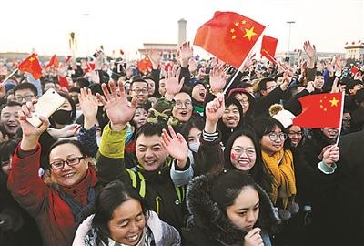 “再堅持一下,還有30分鐘?!碧柹鹎皻鉁氐椭?5℃至-6℃。在等待的人群中,大家相互鼓勵。7時25分,“中國,加油!”不知道誰在隊伍里喊了一句,緊接著,一陣又一陣的歡呼聲,一浪高過一浪,直到升旗儀式開始。
