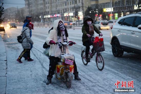 1月6日晚,內(nèi)蒙古呼和浩特市迎來2018年首場降雪,路面濕滑,民眾出行受到一定影響。中新社記者 劉文華 攝