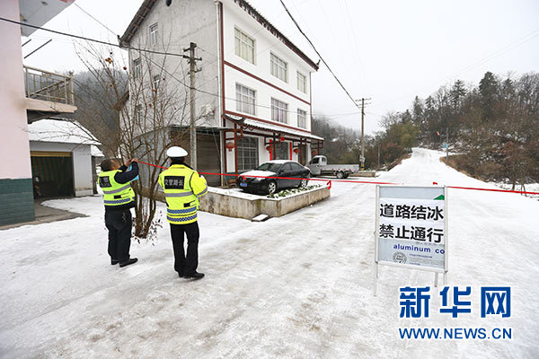 因道路坡陡,路面結(jié)冰,湖北五峰土家族自治縣“路長”朱漢軍(左)和袁樂軍(右)在劉家坳路段拉起簡易警戒線(1月5日攝)。新華社記者 王自宸 攝