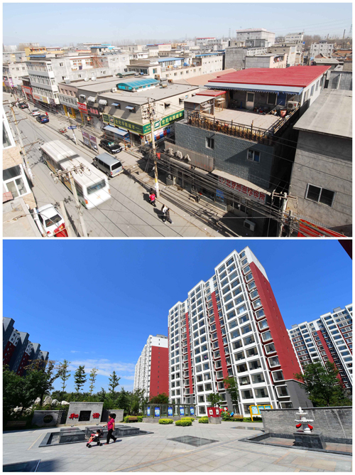 上圖為2010年拍攝的北京唐家?guī)X地區(qū)城中村;下圖為2014年8月拍攝的環(huán)境得到改善的唐家?guī)X地區(qū)回遷樓