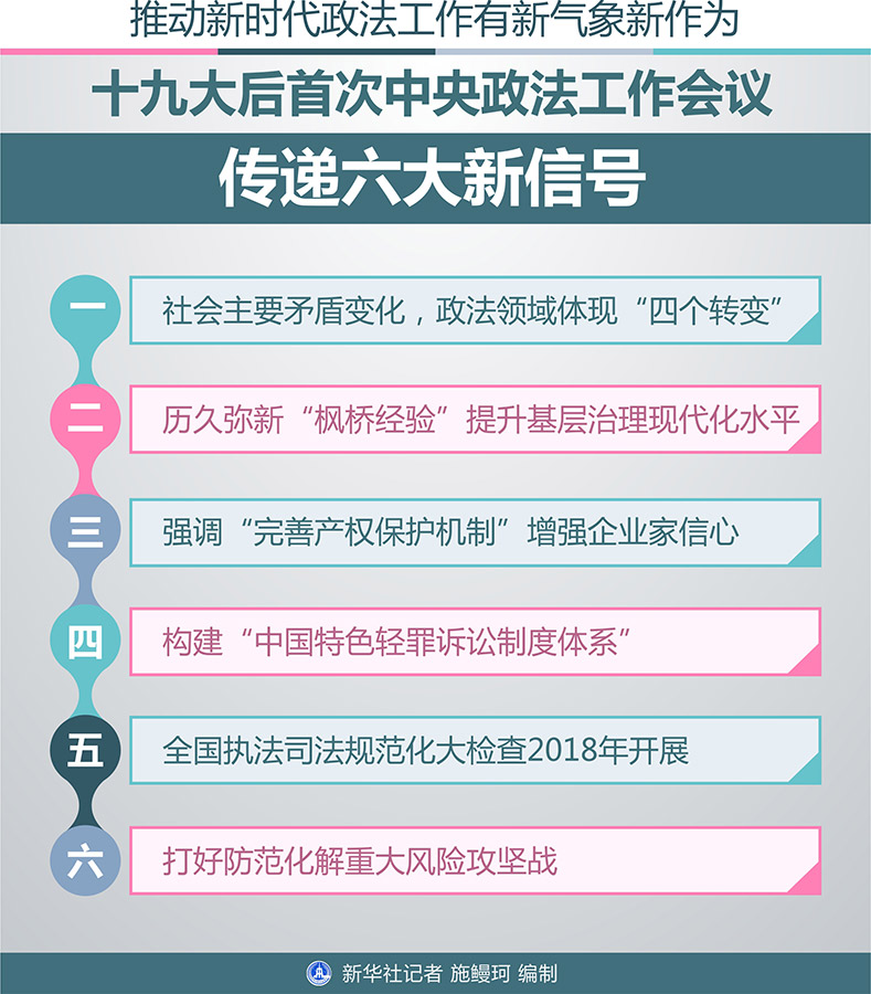 新時(shí)代政法工作如何履行好黨和人民賦予的職責(zé)使命?2018年政法工作提出哪些新要求、作出哪些新部署?22日至23日,黨的十九大后首次召開的中央政法工作會(huì)議傳遞了新信號(hào)。新華社記者采訪權(quán)威專家為你解讀。