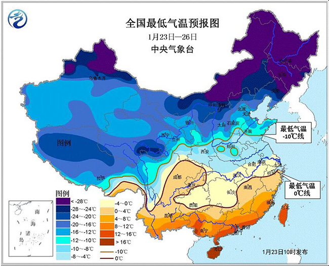 1月23日至月底,影響我國的冷空氣頻繁且勢力較強。23-26日,受強冷空氣影響,中東部大部地區(qū)自北向南先后有4~5級偏北風,陣風6~7級;黃淮及其以南地區(qū)氣溫下降6~8℃,部分降溫幅度可達10~12℃。在此期間,中東部大部地區(qū)日平均氣溫較常年同期偏低2~5℃,部分地區(qū)偏低6℃以上。最低氣溫0℃線將南壓至浙江北部、江西北部、湖南南部至貴州南部一線,-10℃線位于甘肅東南部、陜西中部到河北南部、山東中部一線。我國東部和南部海區(qū)先后有6~8級、陣風9~10級大風。