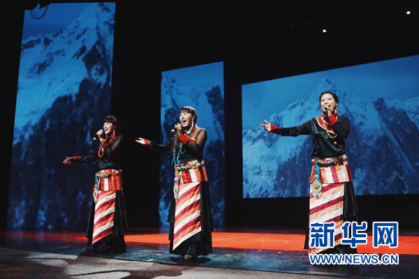 藝術(shù)團(tuán)演員為現(xiàn)場(chǎng)貴賓敬獻(xiàn)哈達(dá)。
