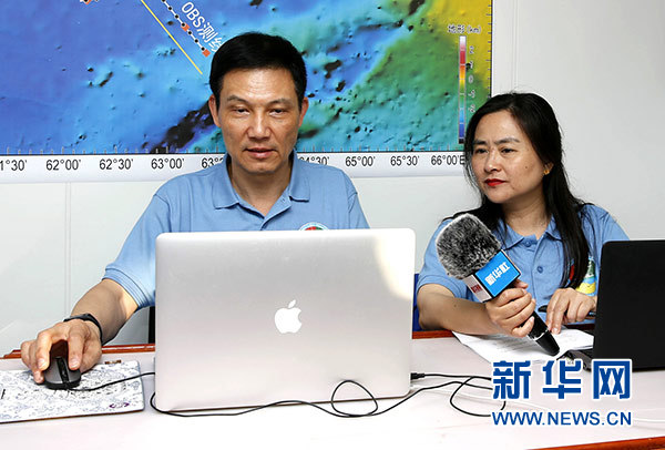 1月25日,中巴首次北印度洋聯(lián)合考察首席科學家林間(左)在“實驗3”號科考船上進行“海上科普”直播。新華社發(fā)