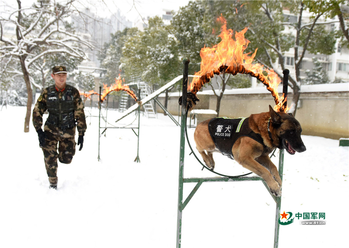 1月27日,武警安徽總隊機動支隊警犬班班長王營廣帶領(lǐng)警犬“魯克”進行穿越火圈訓練。