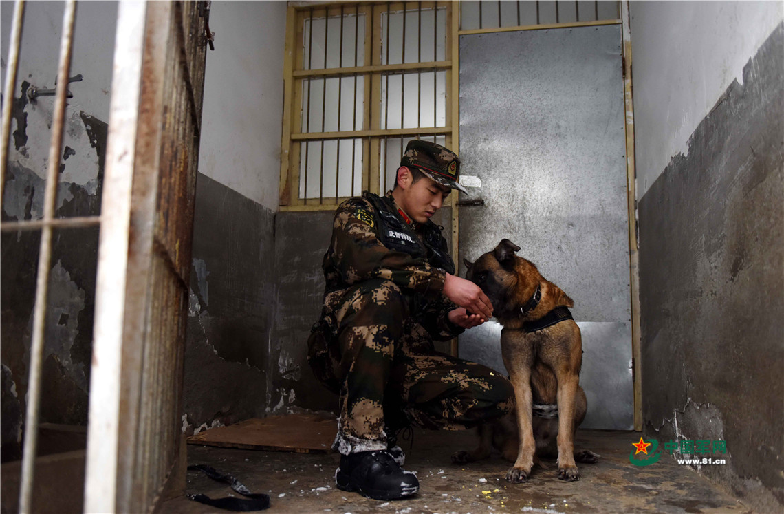1月27日,武警安徽總隊(duì)機(jī)動(dòng)支隊(duì)警犬班班長(zhǎng)王營廣在給警犬“魯克”喂食煮雞蛋。