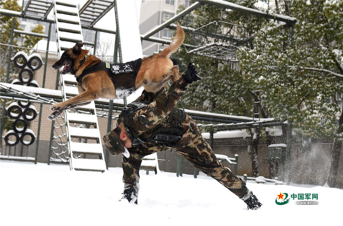 1月27日,武警安徽總隊(duì)機(jī)動(dòng)支隊(duì)警犬班班長(zhǎng)王營(yíng)廣與警犬“魯克”進(jìn)行人犬結(jié)合訓(xùn)練。