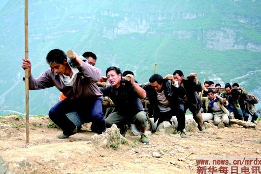 涼山州甘洛縣烏史大橋鄉(xiāng),正在建設(shè)家鄉(xiāng)的當(dāng)?shù)厝罕妸^力抬電線桿,向山頂?shù)亩捍迮实恰P氯A社記者 蔣作平 攝